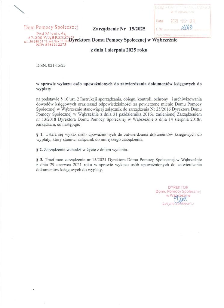Zarządzenie Nr 15/2025 Dyrektora Domu Pomocy Społecznej w Wąbrzeźnie z dnia 1 sierpnia 2025 roku w sprawie wykazu osób upoważnionych do zatwierdzania dokumentów księgowych do wypłaty