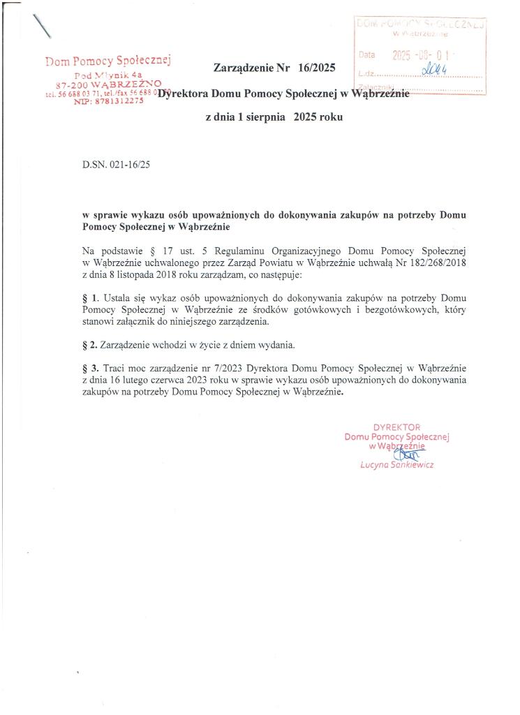 Zarządzenie Nr 16/2025 Dyrektora Domu Pomocy Społecznej w Wąbrzeźnie z dnia 1 sierpnia 2025 roku w sprawie wykazu osób upoważnionych do dokonywania zakupów na potrzeby Domu Pomocy Społecznej w Wąbrzeźnie