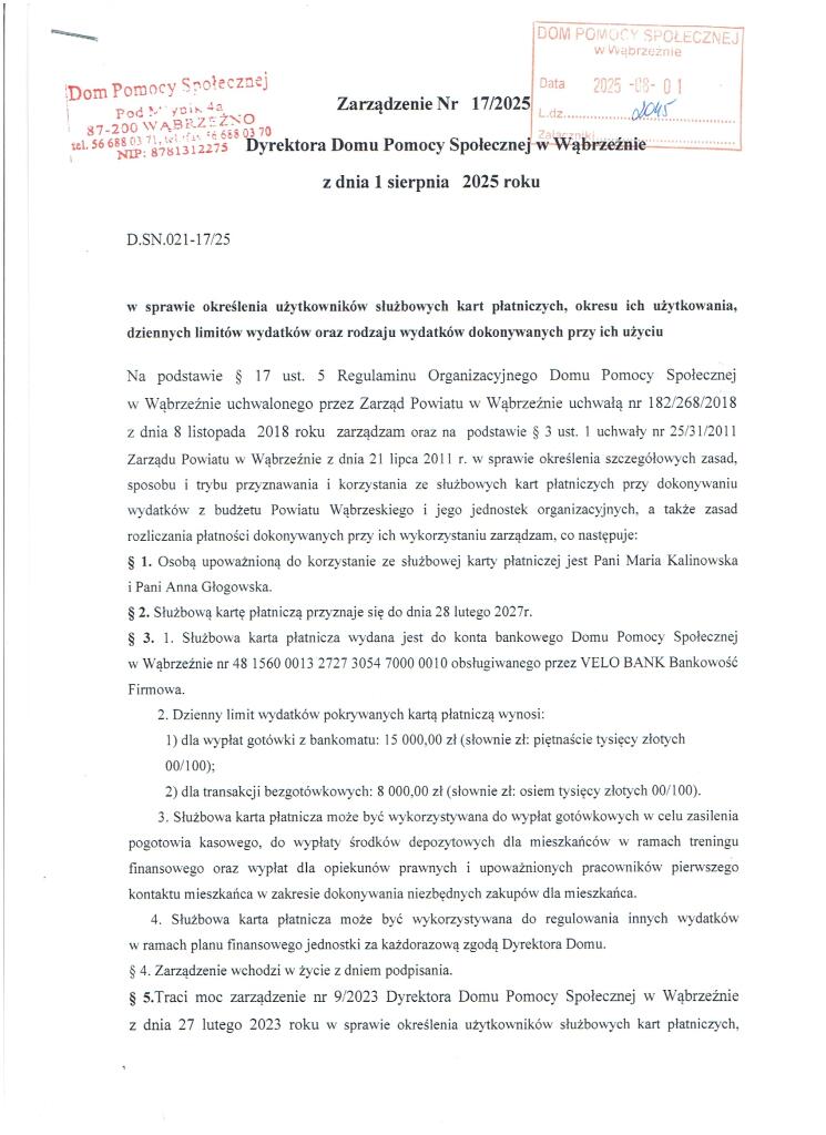 Zarządzenie Nr 17/2025 Dyrektora Domu Pomocy Społecznej w Wąbrzeźnie z dnia 1 sierpnia 2025 roku w sprawie określenia użytkowników kart płatniczych, okresu ich użytkowania, dziennych limitów wydatków oraz rodzaju wydatków dokonywanych przy ich użyciu