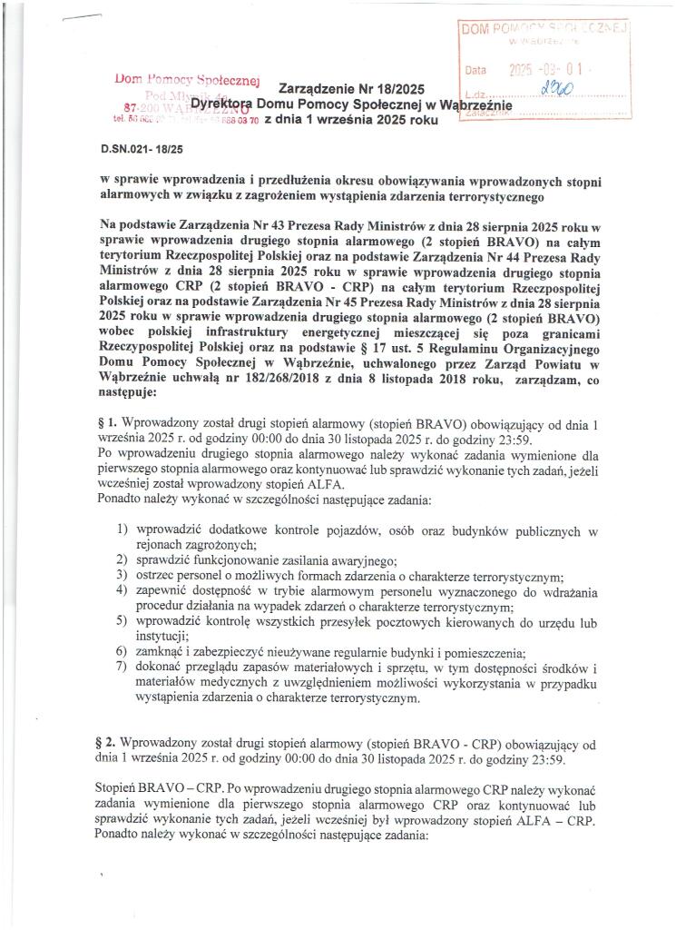 Zarządzenie Nr 18/2025 Dyrektora Domu Pomocy Społecznej w Wąbrzeźnie z dnia 1 września 2025 roku w sprawie wprowadzenia i przedłużenia okresu obowiązywania wprowadzonych stopni alarmowych w związku z zagrożeniem wystąpienia zdarzenia terrorystycznego