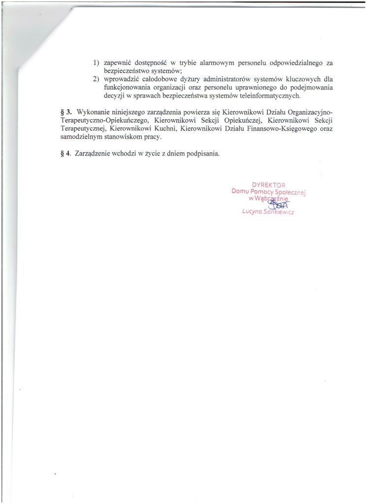 Zarządzenie Nr 25/2024 Dyrektora Domu Pomocy Społecznej w Wąbrzeźnie z dnia 12 grudnia 2024 roku w sprawie wprowadzenia i przedłużenia okresu obowiązywania wprowadzonych stopni alarmowych w związku z zagrożeniem wystąpienia zdarzenia terrorystycznegozarządzenie 25 1.jpeg (198,69KB)