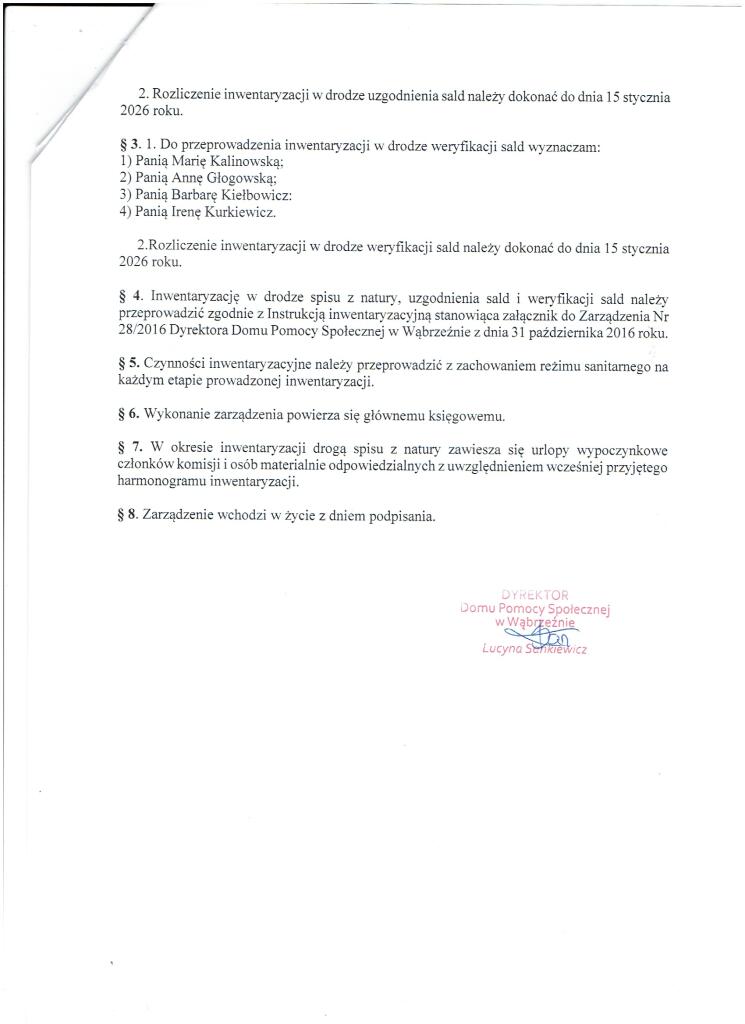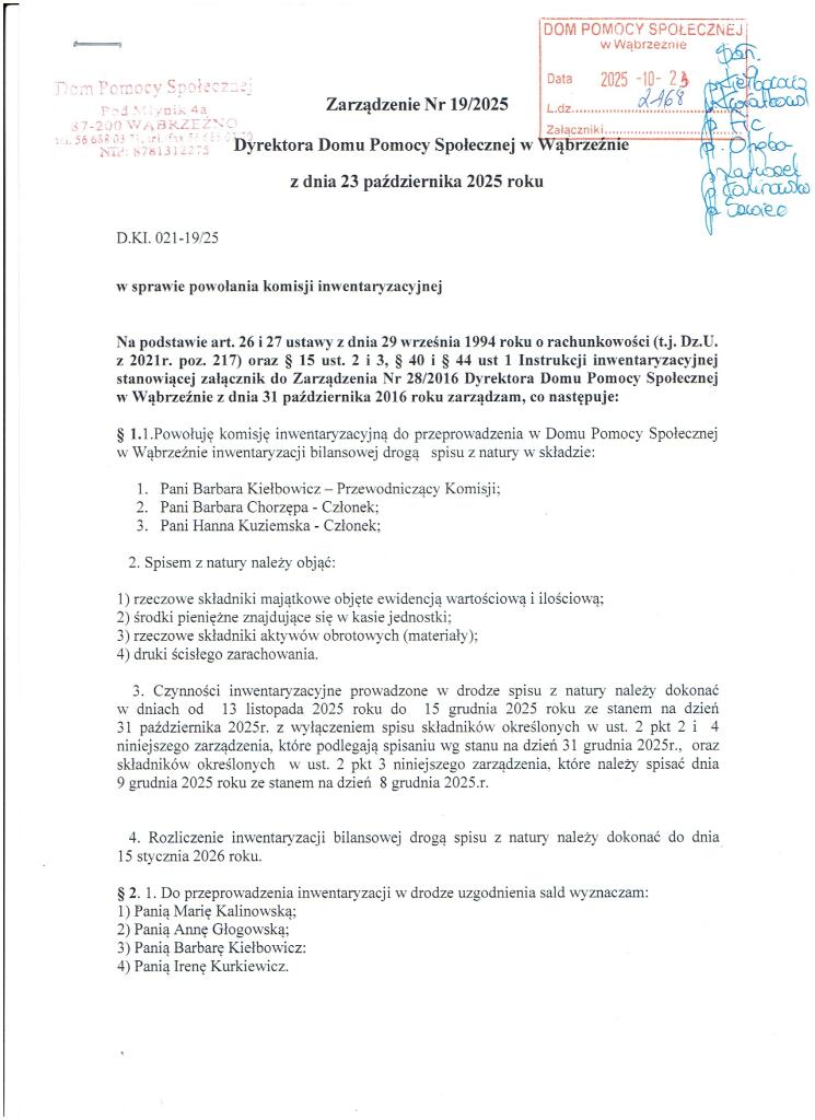 Zarządzenie Nr 19/2025 Dyrektora Domu Pomocy Społecznej w Wąbrzeźnie z dnia 23 października 2025 roku w sprawie powołania komisji inwentaryzacyjnej