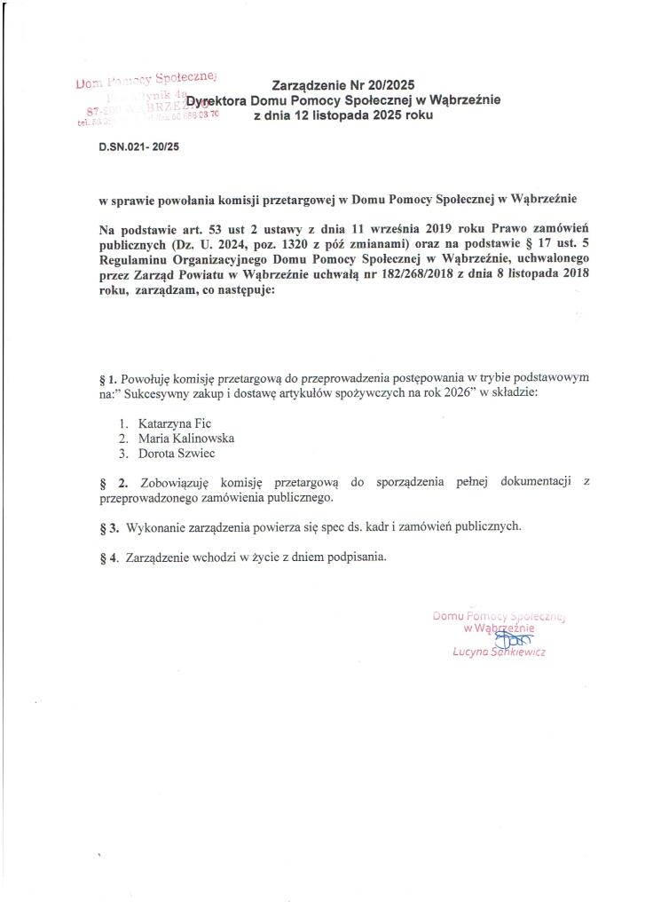 Zarządzenie Nr 20/2025 Dyrektora Domu Pomocy Społecznej w Wąbrzeźnie z dnia 12 listopada 2025 roku w sprawie powołania komisji przetargowej w Domu Pomocy Społecznej w Wąbrzeźnie